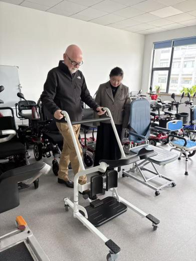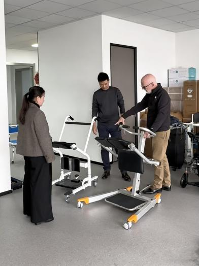 İlgili müdürlerimiz eşliğinde Sayın James, çok fonksiyonlu hasta transfer liftlerinin iki modelini anlattı, örnek yapıları dikkatle inceledi ve yerinde denemeler gerçekleştirdi.